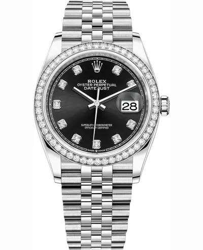 A luxury unisex Rolex Datejust 36 watch, featuring a white gold case and diamond-set bezel with black dial. Equipped with an automatic self-winding movement (Calibre 3235) offering a 70-hour power reserve. Includes a stainless steel case back and a stainless steel/white gold jubilee bracelet with a polished finish and oyster clasp closure. The sapphire crystal provides scratch resistance, while the black diamond dial adds elegance.