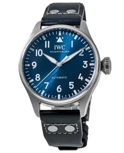 Authentic IWC Pilot's Collection watch with blue dial, stainless steel case and straps. Manual winding mechanical movement (ETA/Maximatic Caliber 82100), automatic winding mechanism, power reserve indicator, day and night hand date function, sapphire crystal glass, screw down crown, Arabic numeral hour markers with minute gradation, transparent case back, water resistant to 100 meters.