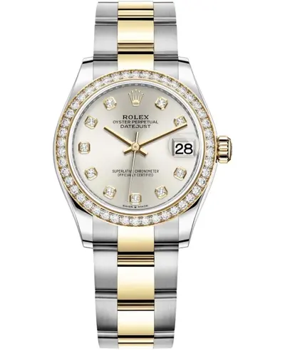 Luxury women's Rolex watch. Features: Yellow Rolesor case, yellow gold and steel bracelet with crown clasp, fixed diamond bezel, silver diamond-studded dial with polished yellow gold hands, automatic self-winding mechanical movement with 55-hour power reserve, date function, scratch-resistant sapphire crystal, round shape, water resistant to 100 meters.