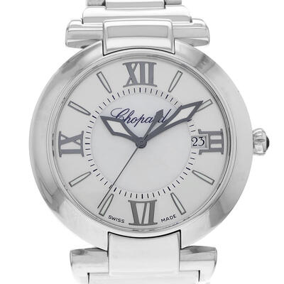 This pre-owned Chopard automatic mens watch features a silver-tone stainless steel case with a sophisticated mother of pearl dial accented by black Roman numeral hour markers and luminous hands for excellent nighttime readability. The fixed bezel adds to its classic appeal, while the scratch-resistant sapphire crystal ensures clear visibility of the timekeeping elements including date display at 3 o'clock. With precise automatic movement and Swiss craftsmanship, these elegant round (40mm) stainless steel bracelet timepieces combine timeless design with reliable performance.