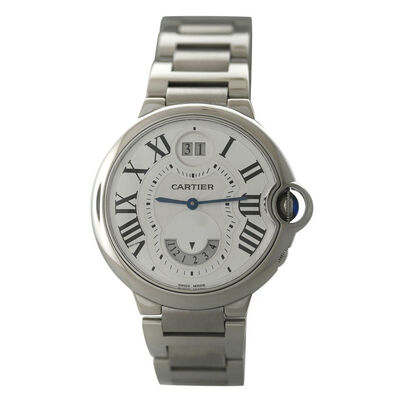 Pre-owned luxury Cartier Ballon Bleu quartz watch. Features a silver-tone dial with Roman numeral markers, blued-steel hands, sapphire crystal glass for scratch resistance, analog display showing hours, minutes, seconds and date at the 12 o'clock position, fixed bezel, stainless steel case and bracelet, round shape, size 38.5mm. Swiss movement inside.