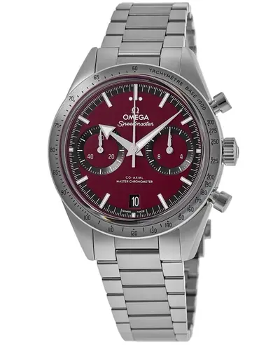 Authentic Omega Speedmaster '57 Chronograph Watch model 332.10.41.51.11.001 featuring a stainless steel case and bracelet. Manual wind movement with Co-Axial Master Chronometer mechanism. Burgundy dial with silver tone hands, index hour markers, minute markers, and two sub-dials displaying date at 6 o'clock, chronograph hours and seconds functions. Includes scratch-resistant sapphire crystal, round 40.5mm case size, water resistance up to 50 meters (165 feet), powered by Omega Calibre 9906 movement with 60-hour power reserve.
