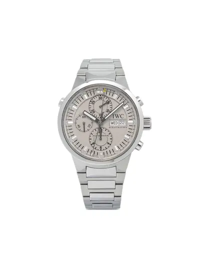 Pre-owned IWC Rattrapante model 22081242. This automatic chronograph boasts a classic design with its 41mm case and grey sunburst dial featuring Roman numeral hour markers for a timeless appeal. The stainless steel case is complemented by a matching stainless steel link bracelet equipped with a folding clasp, ensuring both durability and comfort. Key features include central hours, minutes, and seconds subdials, along with the day and date display visible through an aperture on the dial. Comes with standard one-year warranty from the boutique.