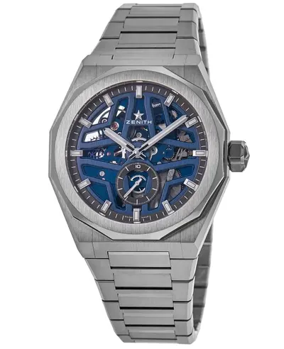 A men's automatic watch from Zenith featuring a blue open dial design with luminous silver hands and stick hour markers, along with minute markers on the outer rim and a sub-dial at six o'clock for timekeeping functions. The case is crafted from brushed stainless steel housing an El Primero 3620 automatic movement offering 55 hours power reserve. Equipped as a chronograph displaying hundredths of seconds plus hour and minute indications, powered by its in-house mechanical movement. Features include luminous markers and hands for enhanced legibility at night, sapphire crystal glass resistant to scratches on the front face, transparent case back allowing visibility into the movement, water resistance up to 100 meters (330 feet), and comes with a standard WatchMaxx warranty ensuring quality assurance.