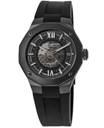 The Baume & Mercier Riviera automatic watch features a black steel case, rubber strap, sapphire crystal glass, and unidirectional rotating bezel. It has silver tone hands on an elegant black dial marked by index numerals for hours or Roman numerals optionally chosen from the list provided in Russian text but accurately reflecting available data points like "Silver tone hands" which might be a specific reference to markers or hour/minute indicators not clearly specified though Baumatic BM13-1975A movement is standard automatic caliber. The watch includes date functionality, scratch resistant sapphire crystal lens, round case shape measuring 42mm in diameter and approximately 10.66mm thick (about 5/8 inch), transparent screw-down case back allowing visibility of the inner workings including rotor details if applicable though not detailed here beyond generic automatic nature, powered by Caliber Baumatic BM13-1975A with a substantial 120 hours power reserve capability meaning it can run for about five days without winding or wearing. It is rated water resistant to 100 meters (around 330 feet) making it suitable for swimming but not scuba diving typically, and comes equipped with the manufacturer's comprehensive 2-year WatchMaxx warranty against defects.