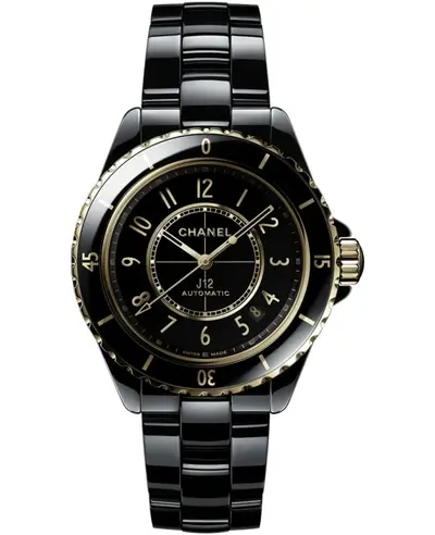 This watch features a black ceramic case with an automatic movement. It boasts a black lacquered dial accented by rose gold-toned hands and Arabic numeral hour markers set against a black ceramic bezel insert with minute markers around the outer rim. The bracelet is crafted from black ceramic, secured by a deployment clasp with push-button activation. Protected by a sapphire crystal with scratch resistance, it offers 200 meters or approximately 660 feet of water resistance and comes equipped with date functionality. A transparent case back allows visibility into the mechanism.