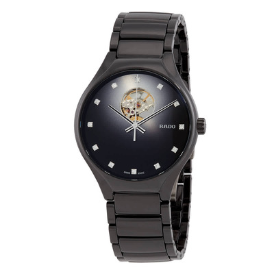 Rado Secret Diamonds automatic watch with black PVD-coated high-tech ceramic case and bracelet, round 40mm dial featuring silver-tone hands on a black background. Powered by Rado Calibre 03.734.331 movement (80-hour power reserve). Scratch-resistant sapphire crystal glass, screw-down bezel, fold-over clasp with push-button release, water resistant up to 50 meters.