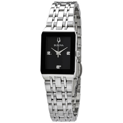 Analog quartz movement. Square stainless steel case with black mineral crystal. Stainless steel bracelet, fixed bezel with faceted design. Black dial featuring silver-tone hands and diamond accents at the 3, 6, and 9 o'clock positions. Pull/push crown operation. Solid case back. Dimensions: 20.5 mm width x 32 mm height x 7.1 mm thickness. Band measures 10 mm wide; equipped with a fold-over clasp containing a push button release mechanism. Water resistant to 30 meters (100 feet). Dress watch style displaying hours, minutes, and seconds.