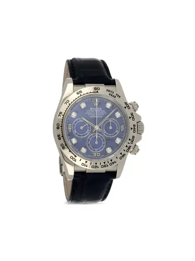 A pre-owned Rolex Daytona model 229737 with a black dial, white gold case and bracelet, round shape, diamond-set bezel insert, embossed Rolex logo on the clasp, automatic chronograph movement, three sub-dials including tachymeter, folding clasp closure, stick hour markers, screw-down sapphire crystal. Comes with original box and papers, standard one-year warranty from boutique.