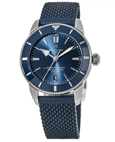 Brand new authentic Breitling Superocean Heritage 44mm automatic men's watch. Features a stainless steel case, blue ceramic rubber strap with deployment clasp. Silver tone dial with index and minute markers on the outer rim, round date aperture at the 6 o'clock position, scratch-resistant sapphire crystal glass. Powered by Breitling Caliber 20 movement with automatic winding functionality and 70-hour power reserve. Includes unidirectional ratcheted bezel for easy timing during activities like diving. Solid case back, water resistant to 200 meters or 660 feet.