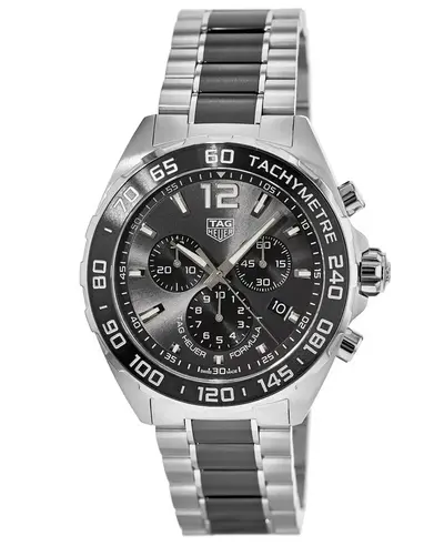 This is a Brand New Authentic Tag Heuer Formula 1 Quartz Chronograph watch with model number CAZ1011.BA0843. It features a Grey Dial with Sunray Effect, a brushed and polished Stainless Steel case, a Deployment clasp bracelet in Ceramic and Steel, an Uni-Directional Rotating bezel, a Quartz Chronograph movement, a Screw Down crown, Scratch Resistant Sapphire crystal, a solid case back, dimensions include a 43mm case size, it is water resistant up to 200 meters or 660 feet, and comes with a 2 year WatchMaxx warranty.
