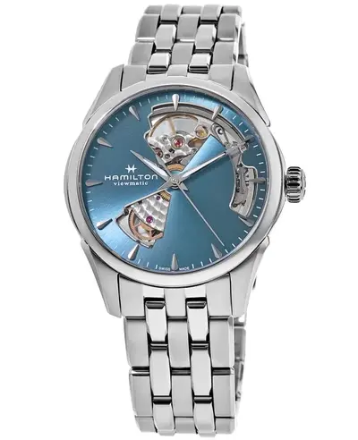 This is a Brand New Authentic Hamilton Jazzmaster model H32215140, an open heart steel men's watch with a blue dial. Features a stainless steel case and silver-colored stainless steel bracelet band combination. The blue dial displays hour markers in the form of indices alongside elegant silver-tone hands that incorporate minute indicators along the outer rim. Equipped with an automatic movement ensuring self-winding functionality for reliable timekeeping, offering approximately 80 hours of power reserve before needing to be fully wound again. Includes standard watch functions displaying hours, minutes and seconds clearly. The transparent case back provides a view into the complex open heart mechanism while the domed sapphire crystal face is both scratch resistant and ensures excellent visibility through its clarity. The round case measures 36mm in diameter making it suitable for most wrist sizes comfortably.