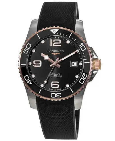 An authentic Longines Hydroconquest men's watch model L3.781.3.58.9 featuring an automatic movement powered by Caliber L888. Its case is made of stainless steel with a black dial displaying rose gold tone hands, Arabic numeral/dot hour markers and minute markers on the outer rim. Equipped with a unidirectional rotating ceramic bezel and a black rubber strap secured by a deployment clasp with push button. The watch includes date functionality, hours, minutes, seconds indicators, and a power reserve display (approx 72-hour). It has a scratch-resistant sapphire crystal glass cover and is water resistant to 300 meters / 990 feet. Comes with a 2-year WatchMaxx warranty.