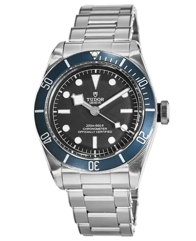 Tudor Black Bay 41 Automatic Blue Bezel Stainless Steel. Polished and satin finish case, stainless steel bracelet with deployment clasp. Unidirectional rotatable bezel featuring a steel insert on a blue anodized aluminium disc. Black dial with silver tone luminous painted hour markers and hands. COSC certified automatic mechanical movement powered by Tudor MT5602 (Manufacture TUDOR). Approx 70-hour power reserve, sapphire crystal glass with screw-down crown. Water resistant to 200 meters / 660 feet. Comes with a 5-year WatchMaxx warranty and solid case back.