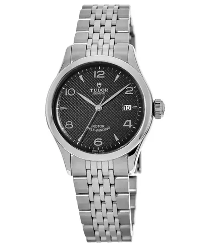 A new Tudor 1926 model M91350-0002 women's watch. Polished stainless steel case with polished stainless steel bracelet and deployment clasp. Fixed bezel. Features a black dial with rhodium-plated hands and Arabic numeral/index hour markers. Powered by an automatic self-winding Tudor Calibre 2671 movement with a power reserve of up to 38 hours. Includes date, minute, second hand functions. Equipped with scratch-resistant sapphire crystal and has a round case shape measuring approximately 36mm in diameter. The watch is water resistant to 100 meters (330 feet) and comes with a 5-year Tudor WatchMaxx warranty.