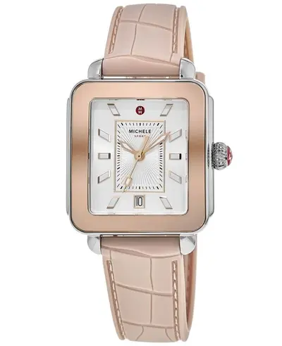 Brand New Authentic Michele Deco Sport White Dial Silicone Strap Women's Watch Model MWW06K000015. Stainless Steel and Rose Gold case with Pink Silicone strap. Tang clasp. Fixed bezel. Dial description: Rose Gold tone hands and Index hour markers with minute markers around the inner rim on a White dial. Battery Operated Quartz movement. Watch functions: Date, Hour, Minute, Second. Scratch Resistant Sapphire crystal. Rectangle case shape. Case size: 36mm x 33mm. Case thickness: 9mm. Solid case back. 50 Meters - 165 Feet water resistant. 2 year WatchMaxx warranty.
