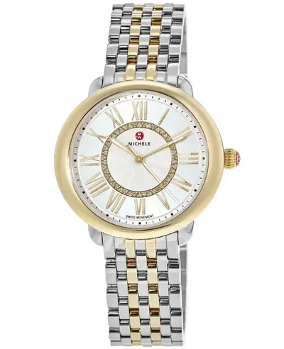 Brand new authentic Michele Serein Mid Two-Tone watch model MWW21B000148. Features a stainless steel and yellow gold case, accompanied by a two-tone stainless steel band with gold tone and silver tone colors featuring a deployment clasp and fixed bezel. The dial showcases a sunray finish in silver white, adorned with Roman numeral hour markers and minute markers along the outer rim, plus a ring of diamonds. Gold tone hands complete the dial presentation. Powered by battery-operated quartz movement providing accurate timekeeping for hours, minutes, and seconds. Equipped with a scratch-resistant sapphire crystal lens, round case shape measuring 36mm in diameter, solid case back, and offers water resistance up to 50 meters (165 feet). Comes with a 2-year WatchMaxx warranty.