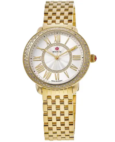 Authentic brand new Michele Serein Mid watch. Features an elegant yellow gold stainless steel case with a gold-tone bezel band secured by a deployment foldover clasp. Includes scratch-resistant sapphire crystal and a battery-operated quartz movement providing accurate hour and minute functions. The silver dial displays gold-tone hands along with Roman numeral hour markers accented by minute markers around the outer rim. Comes in 36mm round case size.