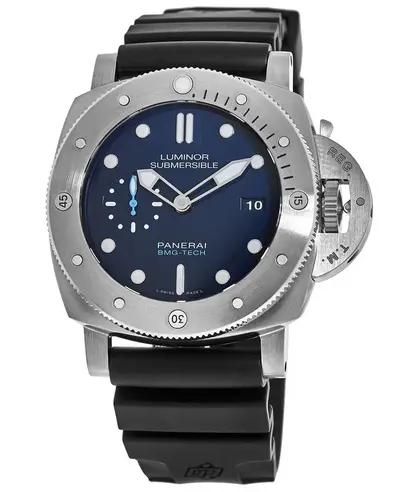 A brand new authentic Panerai Submersible 47mm BMG-TECH model. Features a titanium brushed case, cushion shape, size 47mm and thickness 6mm. Equipped with black rubber strap featuring tang clasp and fixed bezel. The blue dial displays silver tone luminous hands and circle/index hour markers with a small seconds sub-dial at the 6 o'clock position. Powered by Panerai Calibre P.9010 automatic chronograph movement, it includes date functionality at the 3 o'clock window, offers a power reserve of up to 72 hours, boasts scratch-resistant sapphire crystal glass and is water resistant down to 300 meters (approximately 990 feet).