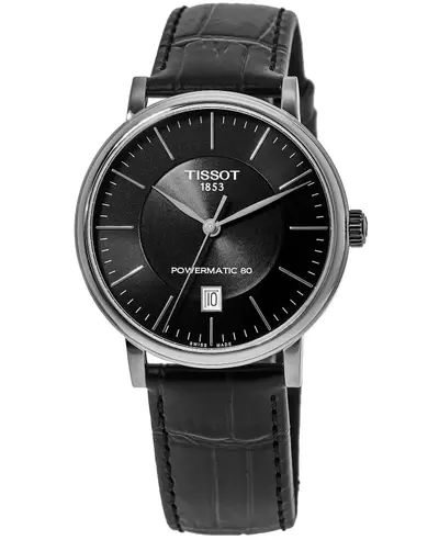 Brand New Authentic Tissot Carson Automatic watch featuring a black dial and silver-tone hands/index hour markers. Includes date functionality, automatic winding with Powermatic 80.111 movement (80 hours power reserve), sapphire crystal glass resistant to scratches, round case measuring 40mm by 10.25mm thickness. Comes equipped with stainless steel casing and a black leather strap, fixed bezel finish. Water resistance up to 50 meters or approximately 165 feet depth.