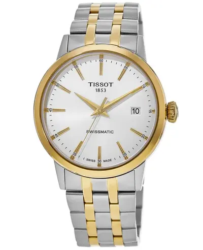 Classic Dream Swissmatic men's watch with two-tone steel case and yellow gold PVD bezel. Features a silver dial, scratch-resistant sapphire crystal glass, automatic movement powered by the Swissmatic engine, 72-hour power reserve indicator on the fixed bezel. Includes date function at the 3 o'clock position (date aperture), deployment clasp with push button mechanism, stainless steel bracelet also treated with yellow gold PVD. Round case measuring 42mm in diameter and having a thickness of 11.5mm. Water resistant to 50 meters or approximately 165 feet.