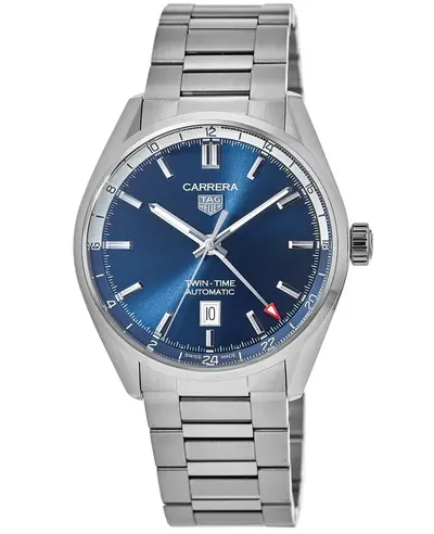Brand New Authentic Tag Heuer Carrera Calibre 7, stainless steel case, stainless steel strap with deployment push-button fold-over clasp and fixed bezel. Features a blue dial with silver luminous hands and hour markers plus minute track. Powered by automatic movement featuring the Caliber 7 module providing up to 50 hours of power reserve. Includes date display, second hand, hour, minute and power reserve indicators. Equipped with scratch-resistant sapphire crystal glass. Classic round case measures 41mm in diameter. Features a transparent screw-down sapphire back for visibility. Rated water resistant at 100 meters (approx. 330 feet). Comes with a standard 2-year WatchMaxx warranty.