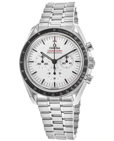 A new authentic men's Omega Speedmaster chronograph watch featuring a white dial, steel case and band with polished finish, tachymeter bezel, luminous hands and markers, three sub-dials for seconds, minutes (30-minute), and hours (12-hour). Powered by the Caliber 3861 Swiss automatic movement with Chronometer certification and approximately 50 hours power reserve. Includes folding clasp, scratch-resistant sapphire crystal, water resistance up to 50 meters/165 feet, and comes with a five-year WatchMaxx warranty.