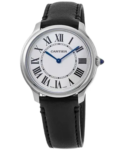 Ronde Must De Cartier, 36mm stainless steel case, black leather strap with tang clasp. Silver dial features blue hands and Roman numeral hour markers plus minute markers on the inner rim. Powered by battery-operated quartz movement (hour, minute functions). Equipped with scratch-resistant sapphire crystal. Round case shape measures 36mm diameter and 7.89mm thickness. Water resistant to 30 meters / 100 feet depth. Comes with a two-year WatchMaxx warranty.