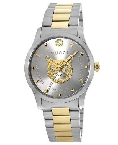 Brand New Authentic Gucci watch model YA1264074. Features a stainless steel case with two-tone stainless steel bracelet equipped with deployment clasp and fixed bezel. Yellow gold tone hour markers mimic the Gucci house motif, complementing the silver dial design enhanced by yellow gold tone hands. Powered by battery-operated quartz movement for accurate timekeeping displaying hours and minutes via pull/push crown control. Features scratch-resistant sapphire crystal lens and a round case measuring 38mm in diameter with thickness of 9mm. Comes complete with solid case back, is water resistant up to 50 meters / 165 feet depth, and includes the manufacturer's 2-year WatchMaxx warranty.