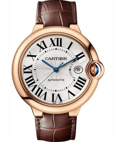 An 18K Rose Gold Cartier case features a fixed bezel and Blue Hands along with Black Roman numeral hour markers on a Silver dial. Includes minute markers around the inner rim, Automatic movement powered by Cartier Calibre 1847 MC engine, Date function, Hour hand, Minute hand, Second hand indicators. Equipped with an 18K Rose Gold Deployment clasp and Brown Alligator leather strap. Features a Fluted Cabochon Sapphire crown, Scratch Resistant Sapphire crystal lens, Round shape measuring 42mm diameter by 13mm thickness solid case back, Water resistant up to 30 meters (approximately 100 feet), Comes with a 2 year WatchMaxx warranty.