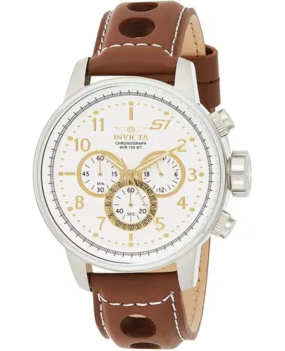 Brand New Authentic Invicta S1 Rally White Dial Leather Strap Men's Watch Model 16010. Stainless Steel case with Brown Leather strap. Tang clasp. Fixed bezel. Dial description: Gold tone hands and Arabic Numeral/Index hour markers with minute markers around the outer rim and 3 sub-dials on a White dial. Japan Movement movement. Chronograph sub-dials display: 60 Second, 60 Minute, 24 Hour. Powered by Hattori Caliber VD54 engine. Watch functions: Date, 24 Hour, Hour, Minute, Second. Pull/Push crown. Mineral crystal. Round case shape. Case size: 48mm. Case thickness: 13mm. Solid case back. 100 Meters - 330 Feet water resistant. 2 year WatchMaxx warranty.