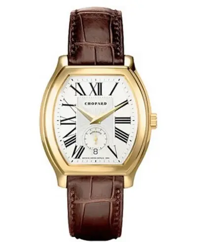 Authentic Chopard L.U.C. men's watch model 162267-0001; Yellow gold case, brown alligator leather strap with tang clasp, fixed bezel on a yellow gold bracelet base; White dial featuring automatic self-winding movement and push down crown; Equipped with scratch-resistant sapphire crystal face; Rated at 50 meters or approximately 165 feet water resistance depth; Comes with a standard WatchMaxx warranty of two years.