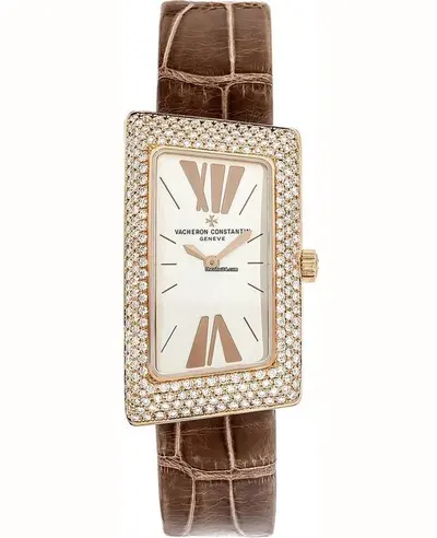 Vacheron Constantin 1972 Cambree. Brand new authentic watch with rectangular silver dial, diamond bezel set and diamond hour markers. Rose gold tone hands and Roman numeral/index hour markers. Brown leather strap with tang clasp. Quartz movement powered by battery. Water resistant to 30 meters (approx. 100 feet). Solid case back, 6.7mm thickness, 37.7 x 21 mm dimensions. Comes with a 2 year WatchMaxx warranty.