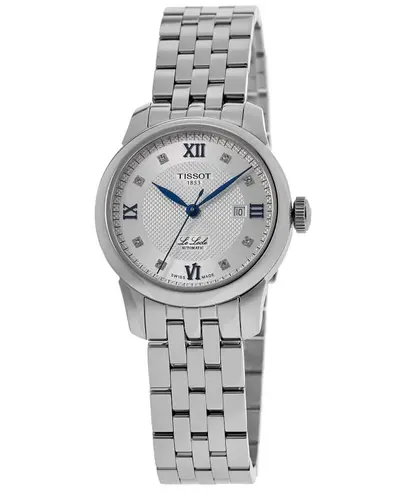 A women's automatic watch from the Tissot Le Locle line, celebrating its 20th anniversary edition with a silver dial and stainless steel case and band. Features polished blue hands and hour markers incorporating Roman numerals, partial diamonds, and minute markers around the outer rim along with date functionality at the three o'clock position. Equipped with an ETA Powermatic movement (engine number: 48.111) offering Swiss precision and a 48-hour power reserve. Constructed from silver brushed and polished stainless steel including a deployment buckle with push-button mechanism, smooth bezel, sapphire crystal glass for scratch resistance, round case measuring 29mm in diameter and approximately 9mm thick which is see-through at the back. Rated water resistant to 30 meters (100 feet) depth and comes with a two-year WatchMaxx warranty.