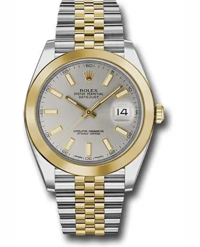 Metal Case: Stainless Steel with 18kt Yellow Gold; Strap/Band Material: Stainless Steel and 18kt Yellow Gold; Clasp Type: Folding Clasp; Bezel Finish: Smooth; Dial Color/Finish: Silver; Movement Type: Automatic Self Winding; Crown Style: Screw Down; Crystal Material: Scratch Resistant Sapphire; Case Size Diameter: Approx. 41mm; Solid Case Back; Water Resistance Depth: Approximately 330 feet (100 meters); Included Warranty: WatchMaxx 5-Year