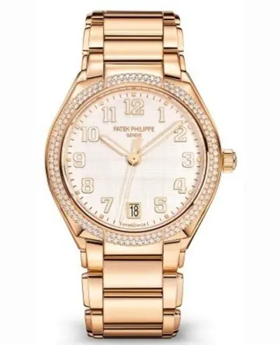 Brand New Authentic Patek Philippe Twenty4 Model 7300/1200R-010. Polished 18kt rose gold case with diamond-set fixed bezel, accompanied by a polished 18kt rose gold bracelet equipped with a deployment clasp. The silver dial features satin finishing and is adorned with Arabic hour markers alongside rose gold luminescent hands displaying the date at the six o'clock position. Equipped with an automatic self-winding Patek Calibre 324 SC movement offering approximately 45 hours of power reserve, it includes functions for timekeeping (hours, minutes, seconds) and date display. Features a screw-down crown, scratch-resistant sapphire crystal lens, transparent case back revealing the mechanical movement, round case shape measuring 36mm in diameter and 10.05mm thick, ensuring water resistance up to 30 meters or 100 feet.