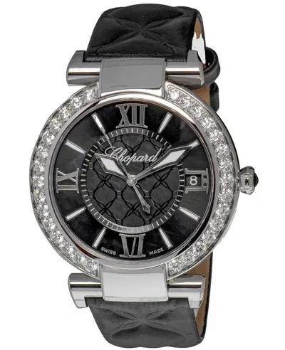 Brand New Authentic Chopard Imperiale. Stainless steel case, black leather strap with tang clasp. Fixed diamond set bezel. Silver tone hands and Roman numeral/index hour markers with minute markers on a black onyx dial. Automatic self-winding movement powering the date, hours, minutes, seconds functions. Scratch resistant sapphire crystal lens. Round 40mm case shape. Water resistance: 50 meters / 165 feet. Supplied with two-year WatchMaxx warranty.