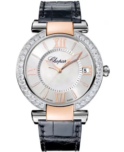 A women's automatic watch from Chopard featuring a steel and rose gold case, measuring 40mm in diameter with a thickness of 10.5mm. It includes a fixed bezel set with diamonds and comes equipped with a black alligator leather strap secured by a tang clasp. The dial is crafted from mother-of-pearl displaying Roman numeral hour markers, index markers, and minute markers along its inner rim; the hands are finished in rose gold tone. Powered by an automatic movement, this timepiece offers functions for date, hours, minutes, and seconds. It features scratch-resistant sapphire crystal glass, a round case shape, and is water resistant up to 50 meters (165 feet). Backed by a 2-year WatchMaxx warranty.