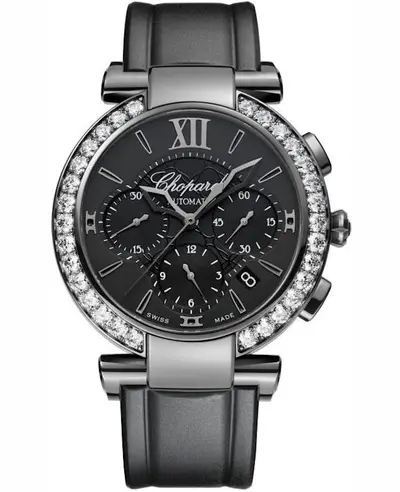 Automatic Chronograph Movement, Skeleton Hands, Roman Numeral Hour Markers with Minute Markers around Inner Ring, Fixed Diamond Set Bezel, Minute Sub-dial (60 Seconds), Hour Sub-dial (12 Hours), Date Display between 4 and 5 O'clock Position, Minute Counter Sub-dial (30 Minutes), Black PVD Stainless Steel Case, Black Rubber Strap with Tang Clasp, Scratch Resistant Sapphire Crystal, 42-Hour Power Reserve Indicator, Round Case Shape 40mm Diameter, Water Resistance up to 50 Meters / 165 Feet