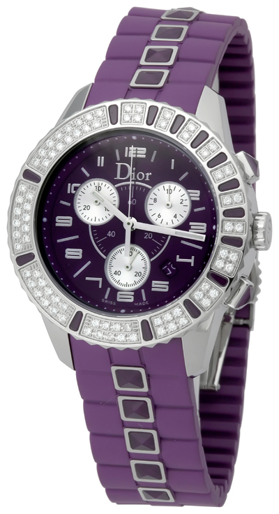 Ladies' pre-owned crystal chronograph watch with purple dial. Features stainless steel case accented with diamonds and a complementary purple rubber strap set with pyramid sapphires on the clasp/bezel. Luminous coated hands and markers enhance legibility in low light conditions. Automatic date display positioned between 4 and 5 o'clock. Chronograph function includes precise second recording via subdials, featuring a row of pyramid sappires displaying elapsed time (1/10 seconds) with integrated 30-minute and 10-hour counters alongside the central chronograph seconds hand. Movement is quartz-based ensuring reliable accuracy without needing adjustments. Scratch-resistant sapphire crystal provides high clarity and durability against impacts or abrasion marks unlike mineral glass alternatives. Case measures 38 mm in width by 12 mm in thickness offering a substantial profile on the wrist yet fitting for its category size expectations. Equipped with push-button deployment clasp providing secure closure without compromising comfort during wear events of varying length including long arm circumferences requiring adjustment freedom or short arms needing minimal bulk around lugs and bracelet sections themselves creating an uncluttered appearance from any viewing angle possible under typical use scenarios extending beyond casual daily wear situations potentially involving jewelry photography displays where bezel prominence matters most especially when comparing lug-to-lug dimensions against other similarly priced luxury wristwatches available through different retailers globally accessible via standard e-commerce platforms supporting diverse payment methods including credit card transactions processed securely according to industry best practices. Water resistant capability rated at 50 meters (165 feet) suitable for recreational swimming activities but not professional diving operations demanding higher pressure tolerance levels due potentially corrosive environments or deeper depths exceeding this specification threshold.