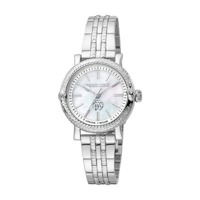 Silver-tone stainless steel case and bracelet. Fixed silver-tone bezel. Mother of pearl dial with applied index hour markers and silver-tone hands featuring Roman numerals for the hours. Minute markers around the outer rim in silver-tone. Analog display showing hours, minutes, seconds via a sweep second hand. Quartz movement. Scratch-resistant sapphire crystal. Round shape measuring 30 mm. Fold-over clasp equipped with safety release mechanism. Water resistant to 50 meters / 165 feet depth. Fashion watch label: Swiss Made.