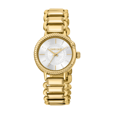 Yellow gold-tone stainless steel case and round bracelet with fixed bezel. Features a silver-tone dial displaying analog time (hours, minutes, seconds) using yellow gold-tone hands and index markers. Powered by a reliable quartz movement and equipped with scratch-resistant mineral crystal lens. Water resistant up to 50 meters / 165 feet depth.