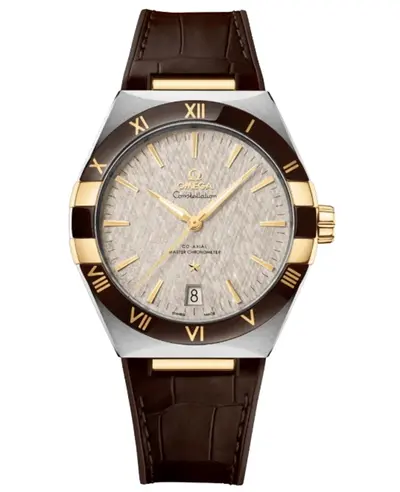 Authentic Omega men's watch model 131.23.41.21.06.002, Master Chronometer certified automatic movement. Features an 18K Yellow Gold case with a polished and brushed finish combined with a brown ceramic bezel featuring Roman numerals. Grey dial accented by luminous yellow gold hour and minute hands along with stick markers and date functionality at the 6 o'clock position. Secured to the wrist via a polished stainless steel folding clasp, fitted with an elegant brown alligator leather strap that includes rubber lining. Includes push-pull crown for winding/setting operations. Equipped with scratch-resistant sapphire crystal glass. Offered in a round case measuring 41mm in diameter and approximately 13.5mm thick. Features a transparent case back revealing the Calibre 8900 movement, along with water resistance up to 50 meters (approx. 165 feet). Comes with a standard 5 year WatchMaxx warranty.