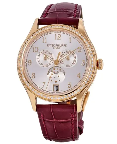 Brand new authentic Patek Philippe Complications watch, model 4947R or 4947R-001. Features an automatic self-winding movement with chronograph complications. Elegant silver sunburst dial on a case made of solid 18K rose gold. Equipped with a fixed diamond bezel and includes the original red alligator leather strap with tang clasp. The sapphire crystal is scratch resistant, ensuring excellent visibility through its transparency. Water resistance up to 30 meters (approx. 100 feet). Comes with a 2-year WatchMaxx warranty.
