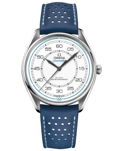 An authentic Omega Specialities men's watch, serving as the Official Timekeeper for the Olympics. Features an automatic chronometer movement (Omega Calibre 8806) with a power reserve of 55 hours. It boasts a white dial equipped with polished black hands and Arabic numeral hour markers along with minute markers around its outer rim including a pulse reader. The case is brushed and polished stainless steel paired with a blue perforated leather strap secured by a polished stainless steel tang clasp. Includes standard hour, minute, second functions via push-pull crown. Protected by scratch-resistant sapphire crystal and has a transparent case back. Water resistant up to 60 meters (200 feet). Comes with a 5 year WatchMaxx warranty. Also known as model number: 52232402004001.