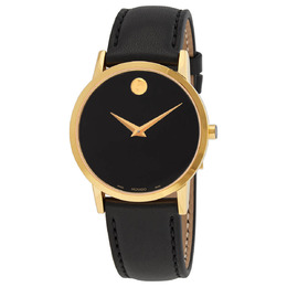 Gold PVD stainless steel case with a black (calfskin) leather strap. Fixed gold PVD bezel. Black museum dial with gold-tone hands. No markers. The Movado dot appears at the 12 o'clock position. Quartz movement. Scratch resistant sapphire crystal. Pull / push crown. Solid case back. Round case shape. Case size: 33 mm. Band width: 18 mm. Tang clasp. Water resistant at 30 meters / 100 feet. Functions: hour, minute. Classic Series. Casual watch style. Watch label: Swiss Made. Movado Classic Quartz Black Museum Disl Ladies Watch 0607584.