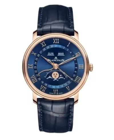 Brand new authentic Blancpain Villeret automatic men's watch model 6654-3640-55B (also known as 6654364055B). Features an 18kt rose gold case, a blue dial with Roman numeral hour markers and rose gold hands. Equipped with date and day functions displayed above the center and below twelve o'clock respectively. Comes on a leather strap.