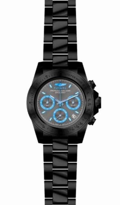 Black ion-plated stainless steel case and bracelet. Fixed black ion-plated bezel showing tachymeter markings. Grey dial with luminous blue hands and index hour markers. Minute markers around the outer rim. Dial Type: Analog. Luminescent hands and markers. Date display between 4 and 5 o'clock positions. Chronograph - three sub-dials displaying: 60 second, 60 minute and 24 hour. Quartz movement. Scratch resistant mineral crystal. Screw down crown. Solid case back. Case diameter: 39.5 mm. Case thickness: 13 mm. Round case shape. Band width: 20 mm. Band length: 8 inches. Fold over clasp with safety release. Water resistant at 200 meters / 660 feet. Functions: chronograph, date, hour, minute, second. Casual watch style. Invicta Speedway Chronograph Grey Dial Black Ion-plated Mens Watch 17313.