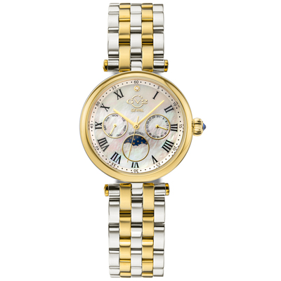 Gold-tone stainless steel case equipped with a two-tone (silver-tone and gold-tone) stainless steel bracelet. Features include a fixed gold-tone bezel, an elegant mother of pearl dial showcasing Roman numeral hour markers accented by diamonds on the face, complemented by gold-tone hands incorporating day/night functionality. Minute track is marked around the outer rim. Powered by a precise quartz movement with analog display and date function at the 3 o'clock position; also includes three-day subdials displaying the day of the week, moon phase, and date functions respectively. Clarity is ensured by a scratch-resistant sapphire crystal lens. A push/pull crown facilitates time setting and winding adjustment. The solid case back adds durability while maintaining the sleek profile. This ladies' watch measures 36 mm in diameter with an 18 mm bracelet width; it employs a deployment clasp activated via a push button release mechanism for easy adjustments and secure fastening. Water resistance is achieved up to 50 meters (approximately 165 feet). Overall, this sophisticated piece features hour, minute, second analog displays, date functionality, moon phase indicator, day display, and quartz movement - embodying the classic "GV2" Florence collection design with a Swiss Made label.