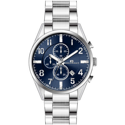 Men's Oceanaut Escapade Chronograph watch model OC5852. Features a stainless steel case and bracelet, fixed silver-tone bezel, blue dial with luminous hands and hour markers, minute track around the outer rim, date display at the 4-5 o'clock position, analog dial type, scratch-resistant mineral crystal lens, fold-over clasp closure with safety release mechanism, water resistance up to 10 ATM (100 meters / 330 feet), powered by a quartz movement, and includes second hand function. Style is a fashion chronograph.